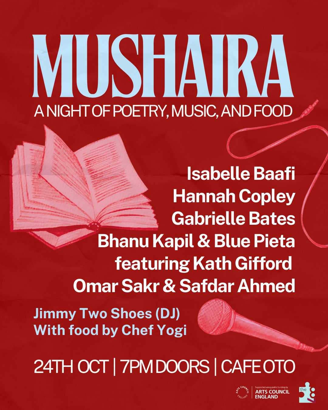 MUSHAIRA - Blue Pieta & Bhanu Kapil (with Kath Gifford) + Gabrielle Bates + Omar Sakr & Safdar Ahmed (virtual) + Hannah Copley + Isabelle Baafi