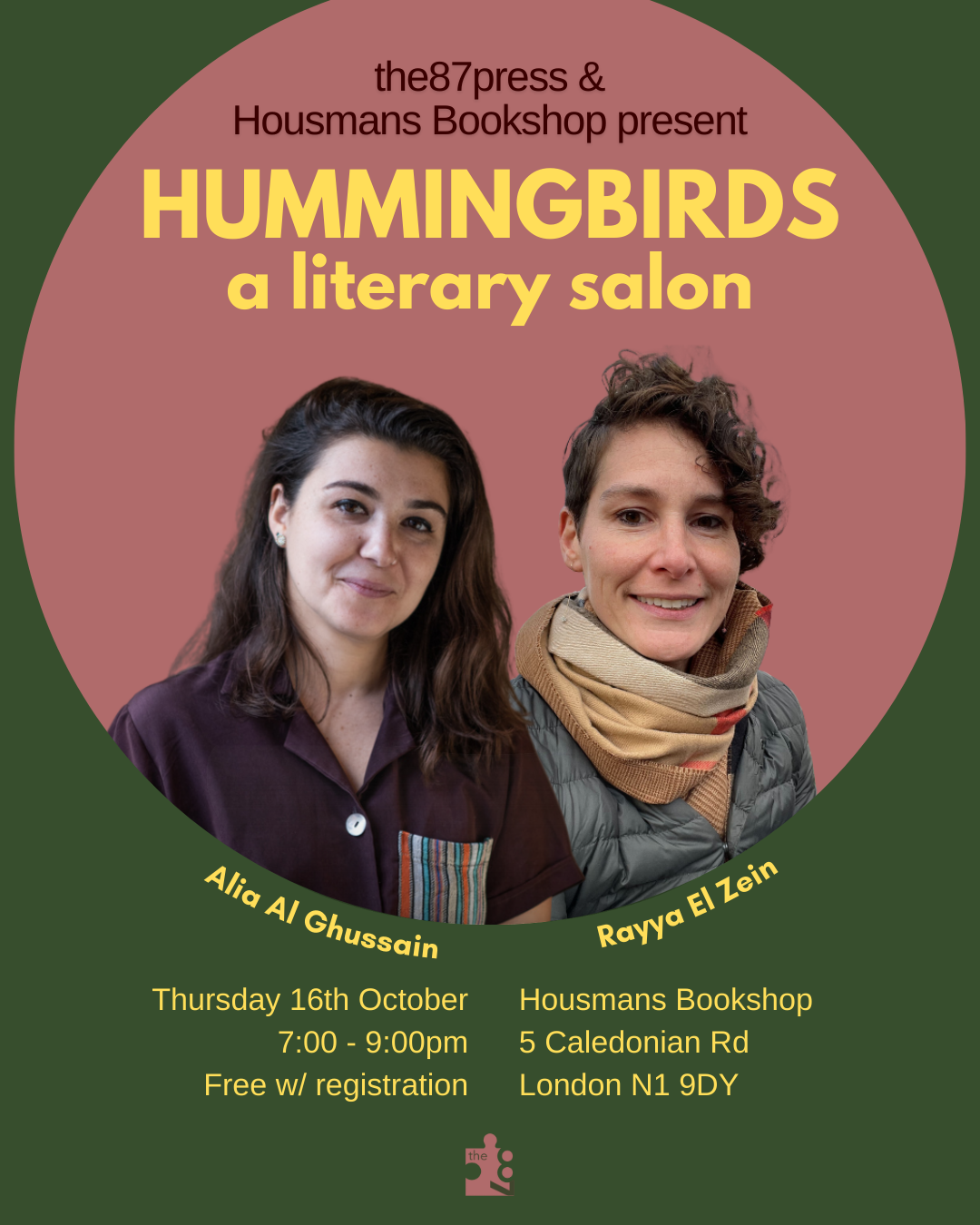 Join the87press for a very special Hummingbirds event featuring Alia Al Ghussain and Rayya El Zein to celebrate the launch of Filling the Head: Listening to Rap in Arabic (Indiana University Press, 2025) at Housmans Bookshop in Kings Cross.