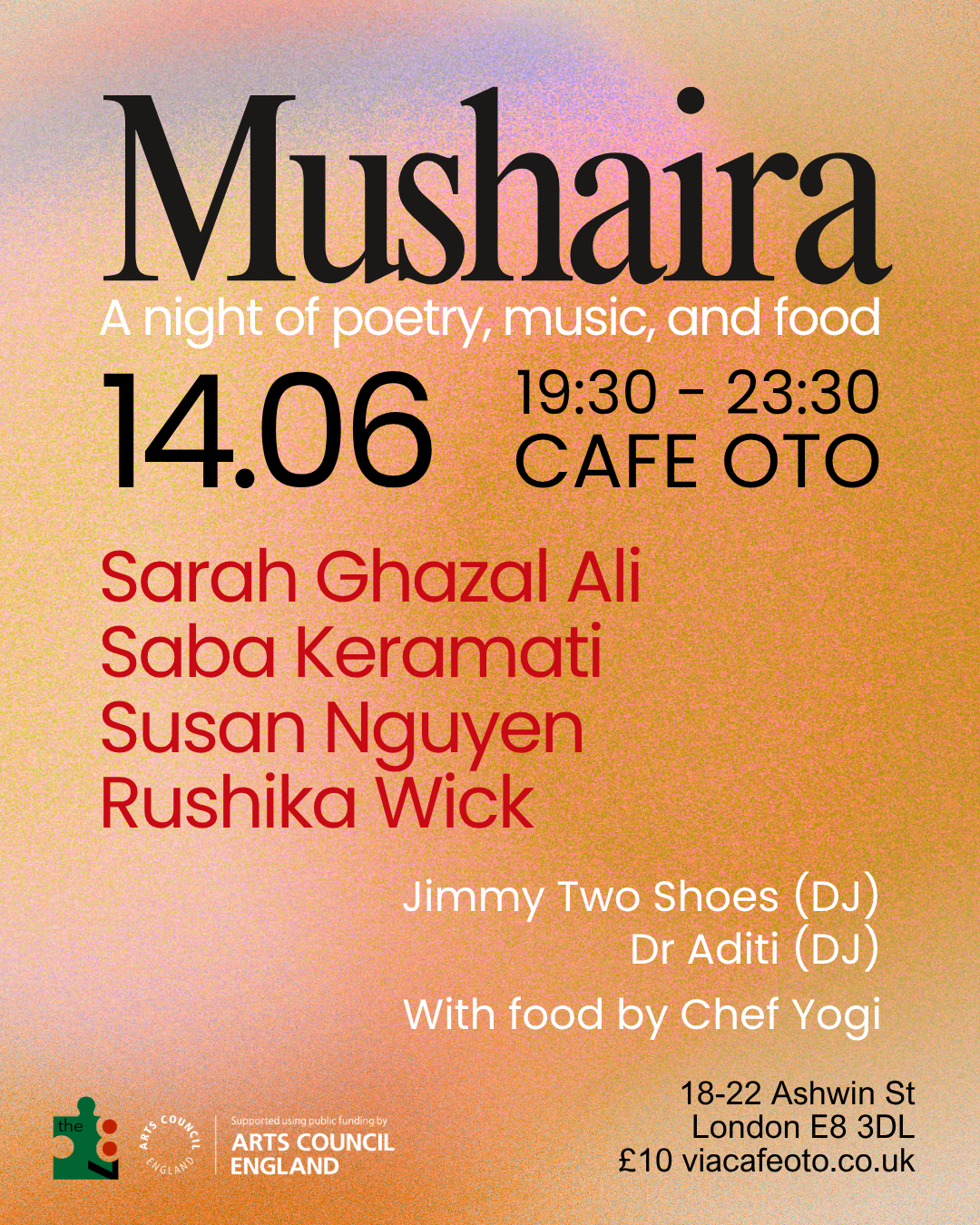 Join us for a very special summer edition of MUSHAIRA — a night of poetry, music, and food. This time joined by four phenomenal poets: Sarah Ghazal Ali, Saba Keramati, Susan Nguyen, and Rushika Wick.