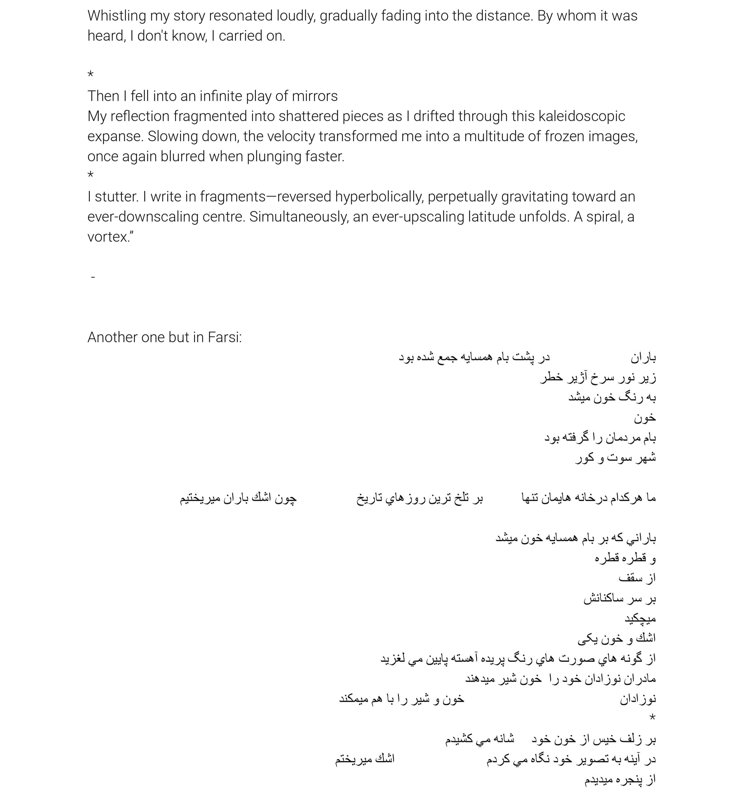 Aliaskar is a recipient of the Castro International Fellowship Award in Rome (2024). He was an associate artist at Open School East (UK), the Institute of Postnatural Studies (Spain), Rupert (Lithuania), and Syllabus V (UK). Aliaskar holds a BFA and MA in Fine Arts and Theory of Art from the University of Tehran and Goldsmiths University of London. Additionally, he has contributed to various programmes and institutions, including LUX Critical Forum, The Sonic and Somatic Transdisciplinary Research and Practice Programme, Advanced Practices, The Centre for Arts Design & Social Research, The New Centre for Research & Practice, and the Barbican Centre's Communities and Neighbourhoods.
